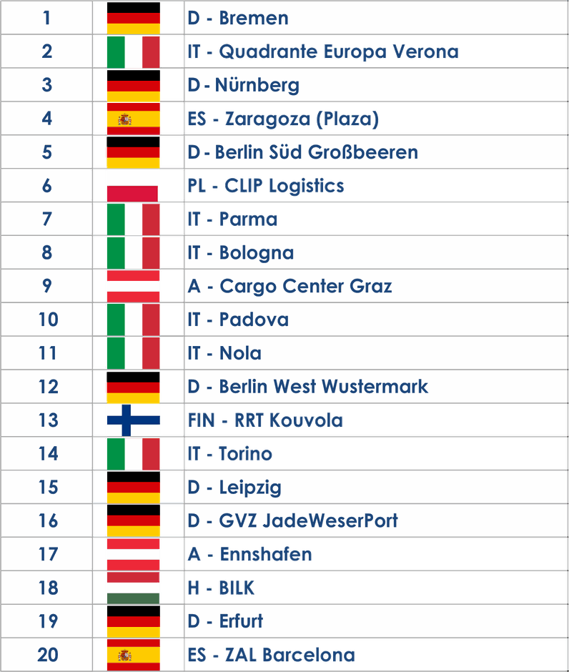 Erstmals nimmt das GVZ Bremen die Spitzenposition im Ranking ein. Es folgen das Interporto Quadrante Europa in Verona sowie das GVZ Nürnberg auf den Plätzen zwei und drei: Auch sie konnten ihre Positionen als absolute europäische Champions behaupten. Ein Gewinner dieses Rankings ist aus deutscher Sicht das GVZ JadeWeserPort Wilhelmshaven mit einem enormen Sprung auf einen Platz in den TOP 20.